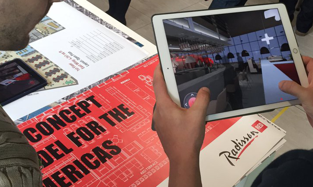 An augmented reality application that allowed users to trigger interactive models of a variety of hotel rooms which could be viewed from different perspectives. The AR was triggered by using the app to scan business cards.